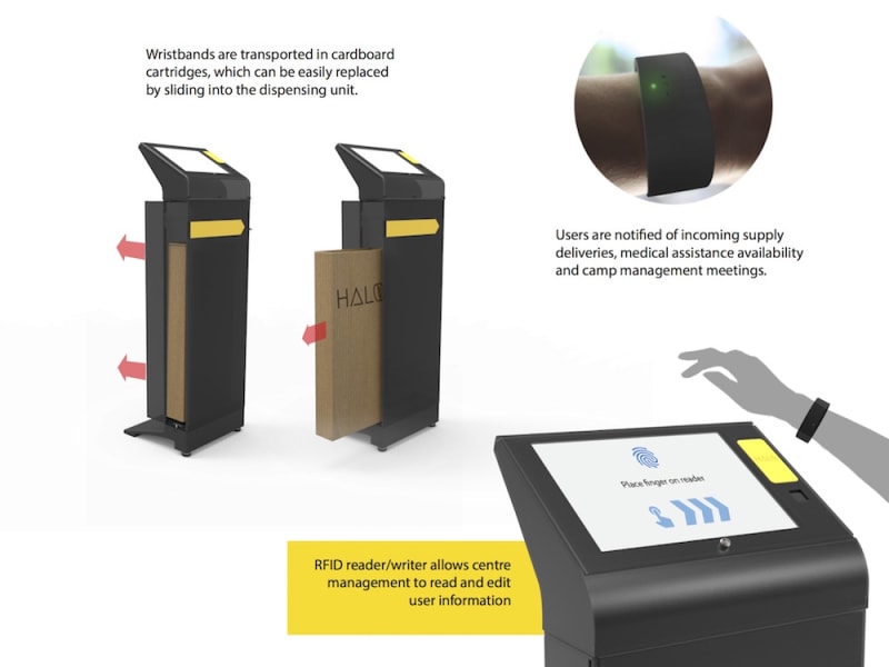 HALO is a human management system to be used in the case of a humanitarian disaster. This includes settings such as refugee camps. HALO helps camp management collect data from people at the camp, so that needs can be prioritised and met in a time of distress and chaos. Currently, the people management system in humanitarian camps is not automated or centralised, causing loss of collected data and inefficiencies in helping the people with their needs. With HALO, people arriving at the relief facility register and are given a wristband by the HALO dispensing unit. This wristband has a RFID unit and stores information about the registrant, such as their personal details, and other vital information (e.g. the need for medical attention or special considerations). The information collected is centralised. Relief workers can access this information and update it as required.