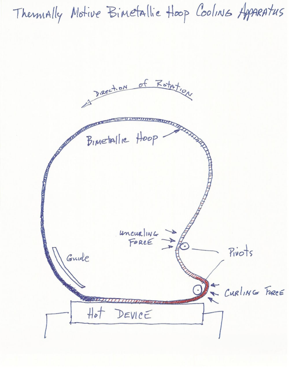 This apparatus involves, in essence, a moving point of contact or, a moving heat sink. Heat energy is absorbed and carried away by means of a bimetallic hoop. The heat energy itself causes mechanical rotation of the hoop. This carries thermal energy away from the device, where it is dissipated and then provides a continual supply of cool material back to the device.