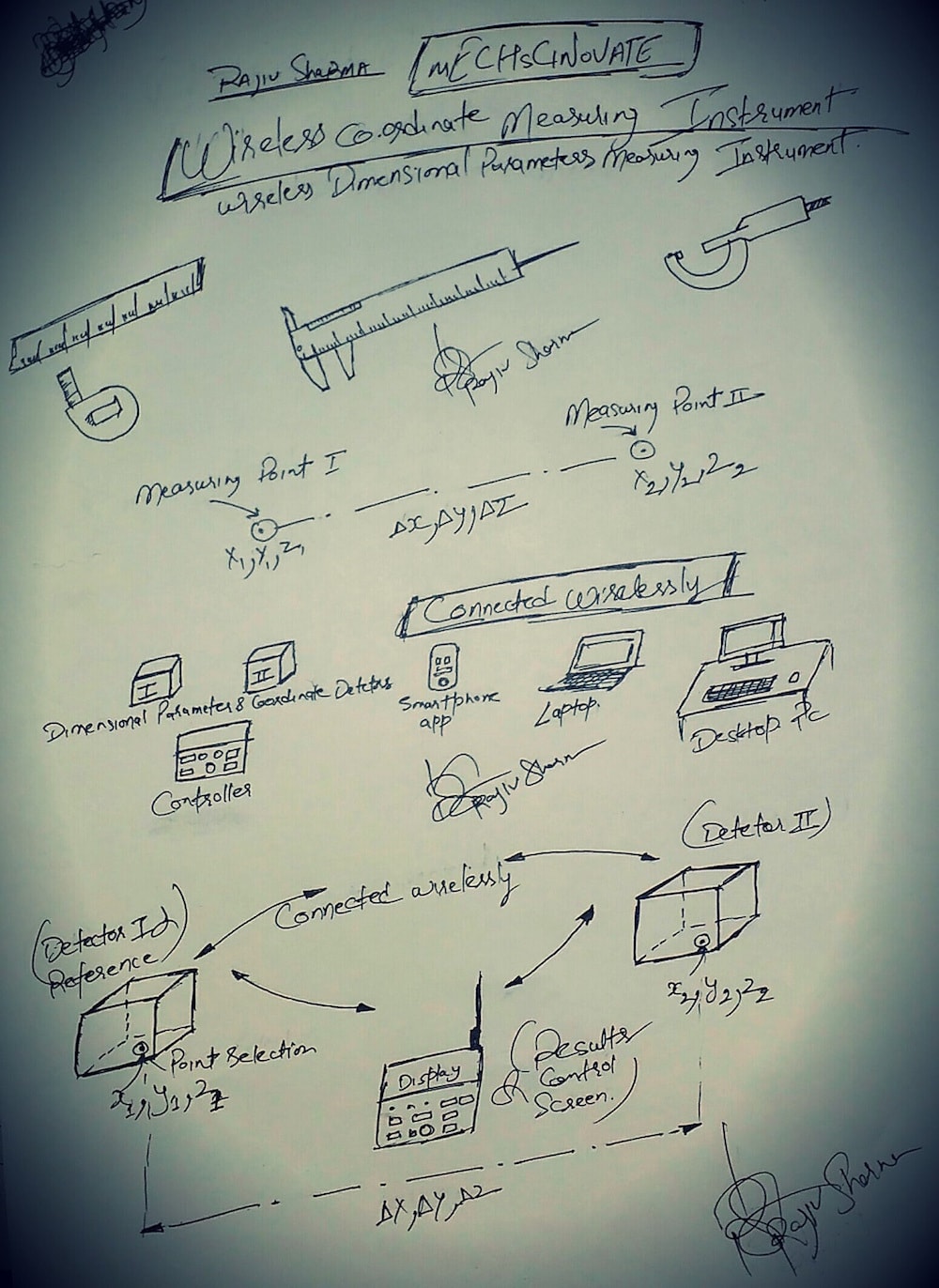 In start, one of the probe has to be set as reference x=0, y=0, z=0. Place the probes at required measuring points. Probes note down the gap between points in terms of X, Y, Z coordinates by referencing the location of one of the probe that has been referenced. The resultant in form of dimensional parameters will be shown on the controller screen and can be shared with watch, mobile and desktop app via cloud computing.