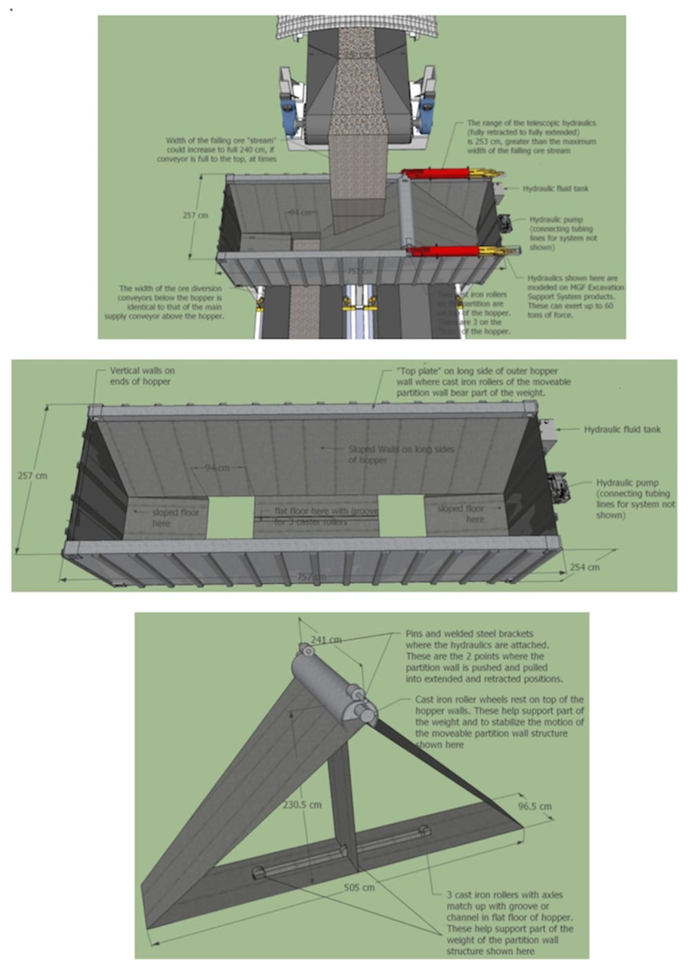 The weight of the inclined partition wall is supported by free-moving cast iron rollers- two on the upper part of the partition wall mechanism, and three on the lower part. These five rollers distribute the weight of the inclined partition wall mechanism, and the weight and force of the moving ore, over a larger area and ultimately down to the massive vertical I-beam columns that support the ore hopper structure. This is significant for durability and stable operation of the diversion mechanism. It is superior to trying to move the entire hopper structure, along with the exit-way from the hopper. Also, the conveyors themselves remain fixed in position.