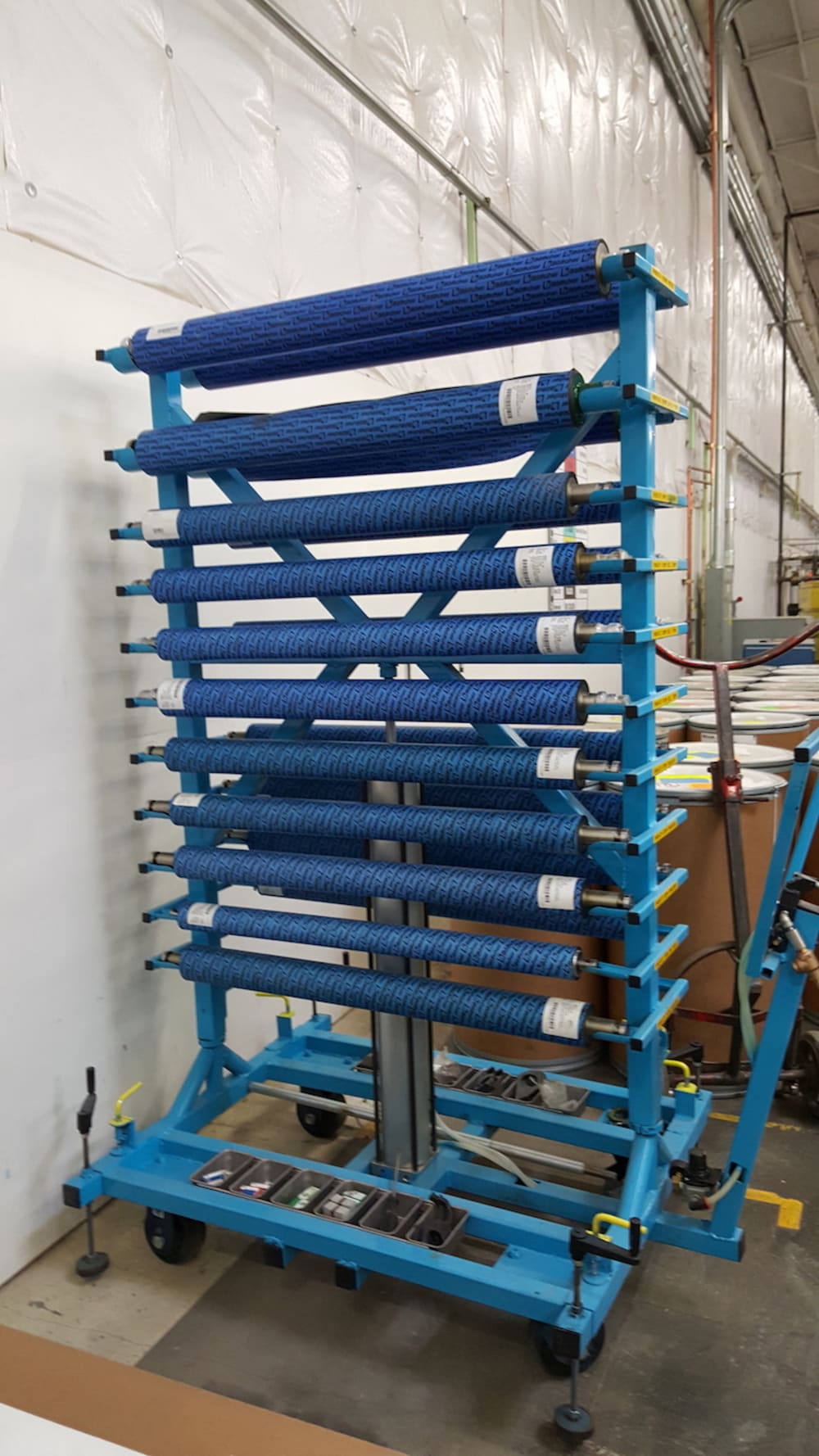 In printing manufacturing (Sheet Fed), maintenance is required to be done on printing rollers (40" to 65"). These presses are on average 4 to 6 ft. from the floor and rollers can be 20-60 lbs. ea. taking 3 men to do rollers in each unit. I watched this in progress and designed a pneumatic lift that would hold all rollers that would lift all to the working height and it now takes only 2 men and less lifting for roller removal and installation. All safety mechanics are in place, also holds all tools required to do the job.