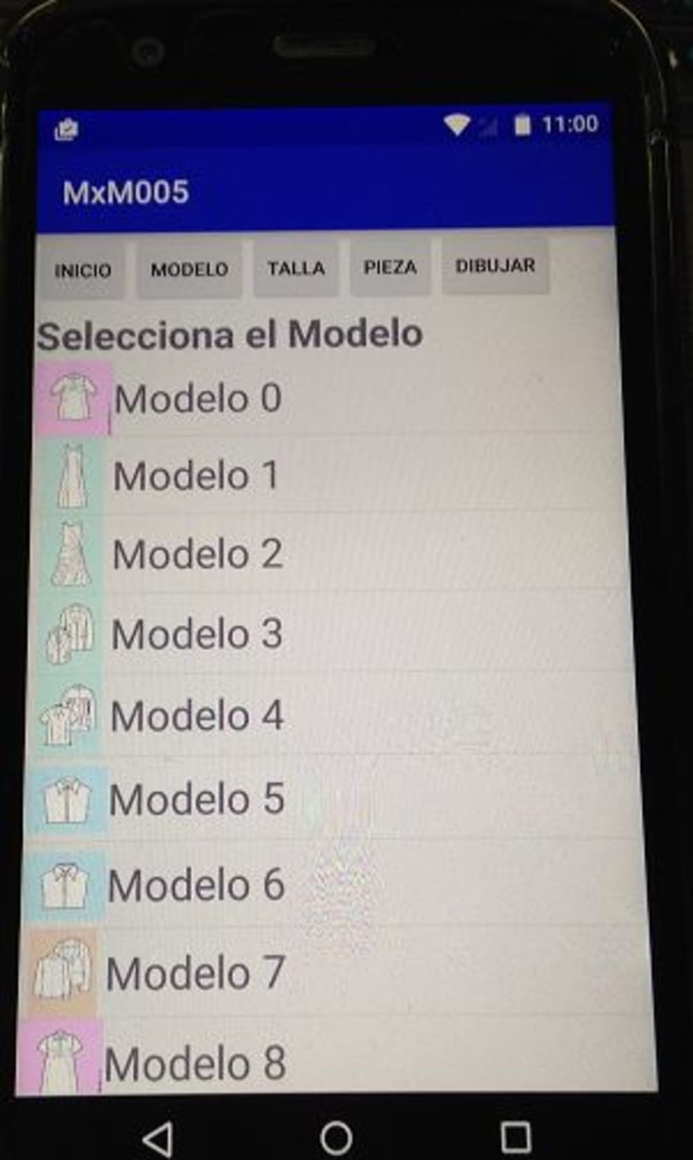 3.- On the phone App, user selects Model, style, size on pattern to draw.