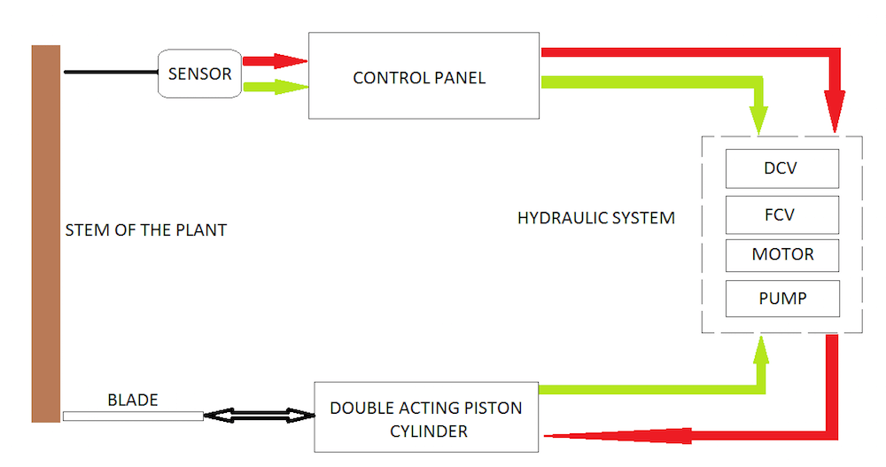 As the sensor touches the stem of the plant it gives the signal to control panel, which further gives signal to solenoid operated DCV for reverse stroke. This action retracts the blade without affecting the plant.