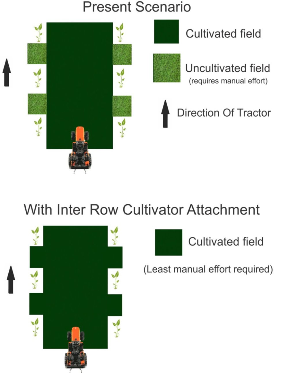 For 1 acre, usually 5 labors are used to remove weeds between successive plants in 2 days; with our product, it is capable of removing weeds at the rate of 1 acre per 3 hours.Minimum operating cost & manual effort.