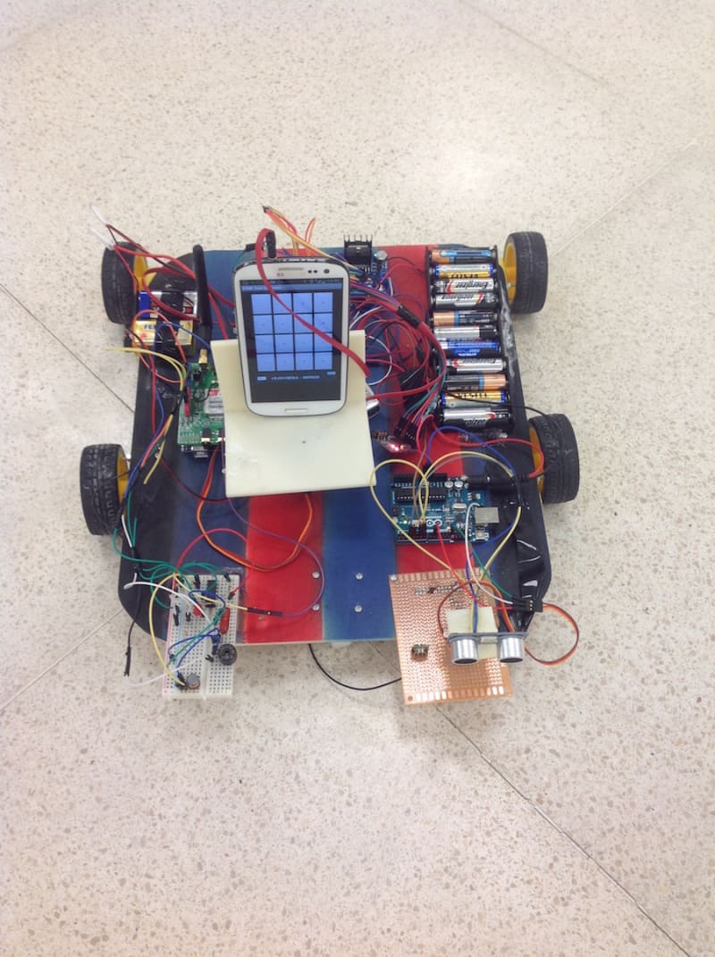 For these reasons, we wanted to do research and a project in this field in order to pave a way for further researches and projects in this field and in order to keep up with the ongoing and growing trend of robotics. Our scope for this project is to create a robot that can be controlled wirelessly by the internet network, so it be controlled from anywhere in the world. Also, we want the robot to be able to record video of the surroundings. Another feature of the robot is that it can calculate and measure distance of the obstacles ahead of the robot. Additionally, the robot is able to detect metals and send a text message informing you of presence of metal. Finally, there is an electronic timer on board of the robot, so when the timer is finished counting, the robot will trigger a small firework that represents the ability of the robot to self-destroy itself when it reaches the enemy lines. The center part of the robot is a set of microcontrollers called Arduino. Arduino is an open source development board intended for both to engineers and hobbits alike. The board has an onboard regulator circuit for feeding the microcontroller with a steady 5V power supply. The board has two microcontrollers; one is for receiving commands from Arduino IDE (The environment which is used for programming the board) while the other is ATMEGA 32 which is the heart of the board and is responsible for controlling and giving commands. Arduino communicates with personal computers through a USB cable (Universal Serial Bus). The IDE of Arduino is based on and very similar to C language which is also very widely used for programming robotics applications. For this project, we have used four Arduinos to complete the function of the robot. And in the next coming sections, we will discuss the function of each Arduino respectively.