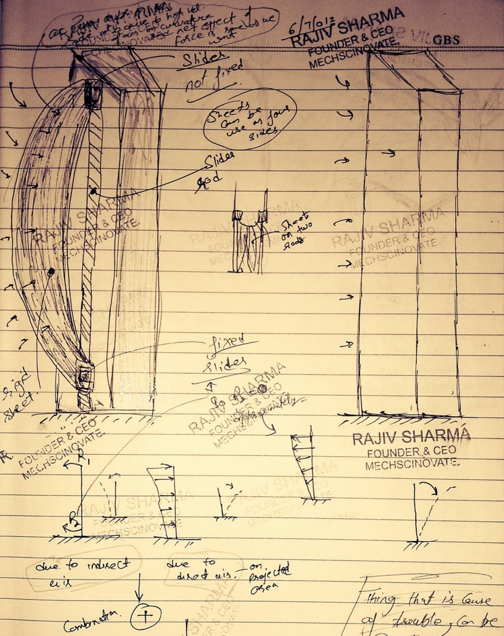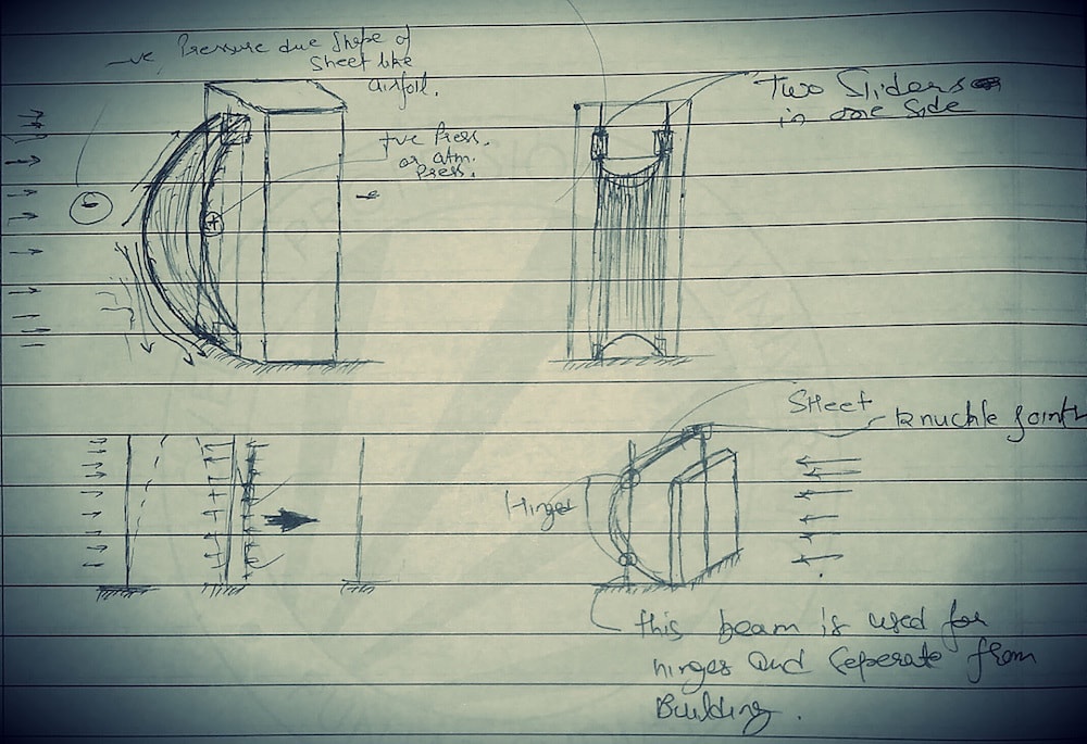 In the image, an elastic sheet has been mounted on an elastic pillar’s end points via sliders to produce counter-forces or movement in opposite direction to deactivate the magnitude of forces developed by air on the building. The aerodynamic forces will tend to bend the building in the direction of the air flow and forces generated by the sheet at the ends of the pillar where it has been attached via sliders will tend to bend the building in the opposite direction. So all net forces and cyclic vibrations will become zero of building or object.