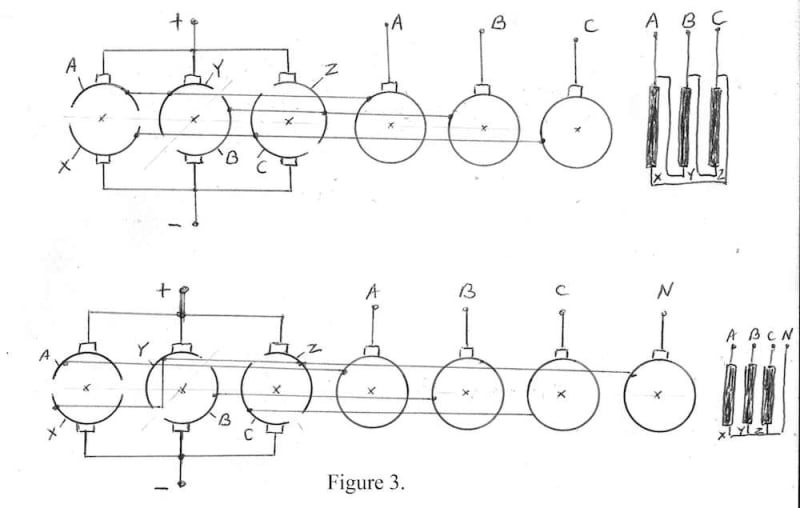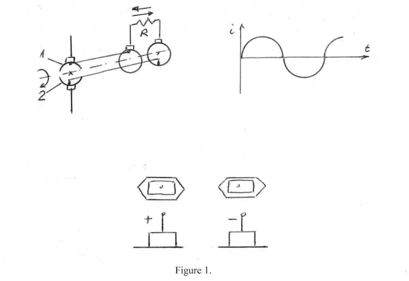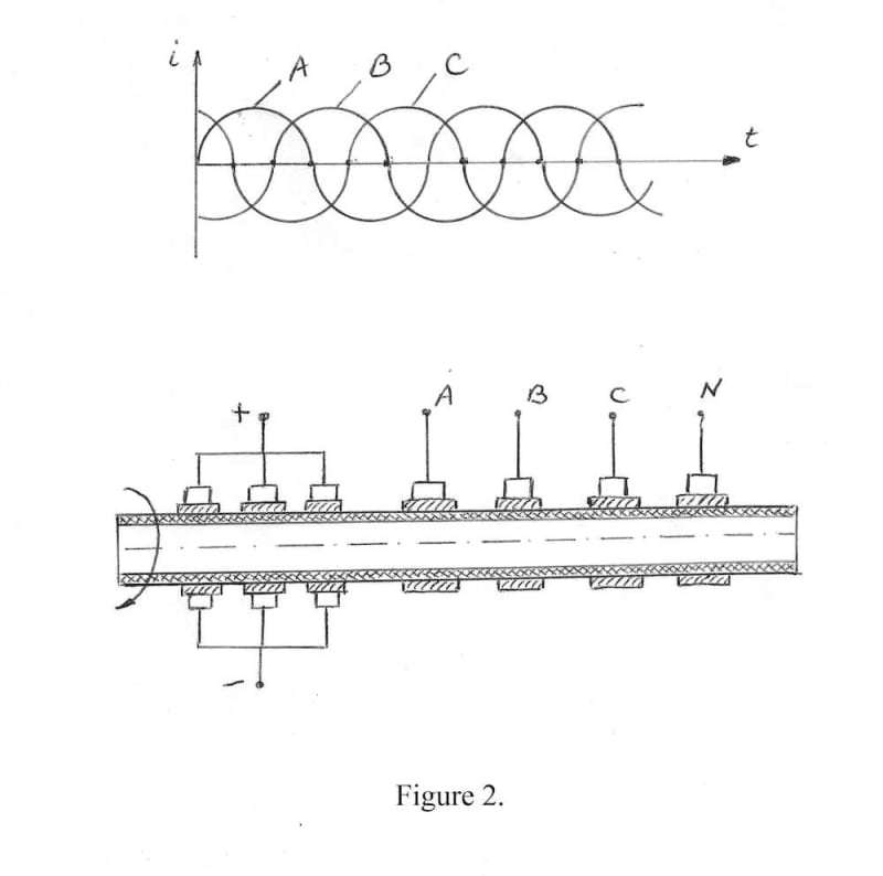 Operation is explained from simple to complex. In Figure 1 one observes single phase alternating current generation using a commutator with two segments of a DC brushed motor that acts as a DC single-phase AC converter.