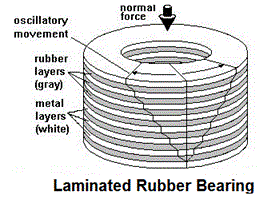 Elastomeric thrust bearings comprise stacks of alternate rubber and metal layers, all bonded together and under compression from a normal load. Illustrated layers are greatly exaggerated in thickness, but are actually so thin (tenths of 1 mm) that they can't squeeze out from between equally thin metal layers.