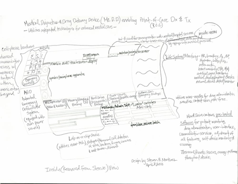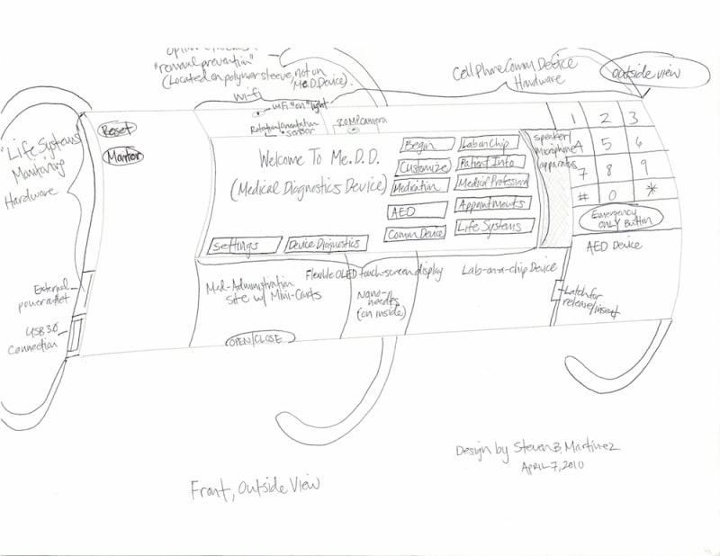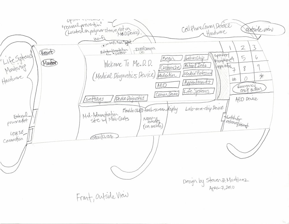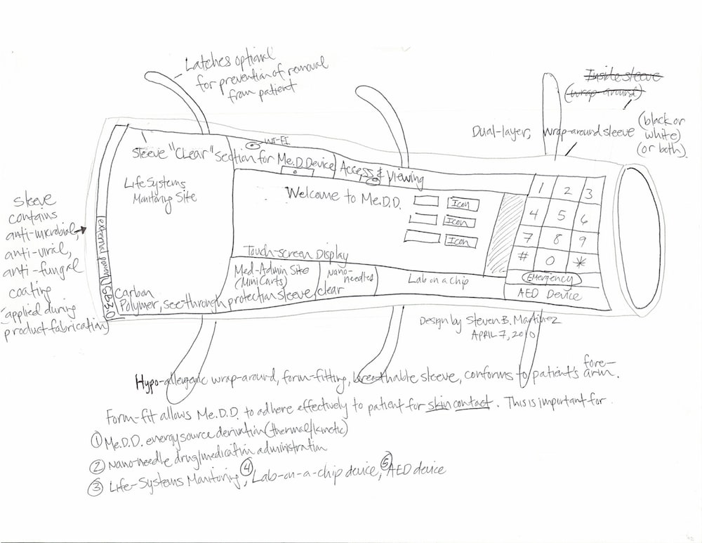 The MeD.D.D.D. is a wearable device for the patient who needs, or desires, round-the-clock life systems monitoring, nano-medication delivery, and other medical device monitoring. It is an integrated “system” that enables medical professional appointments or urgent calls at the click of a button, to be conducted on the flexible OLED screen, so that a patient can literally speak face-to-face with a medical professional. The screen also serves as a control point for the device, in which the user or a qualified professional can enter a security code, or username and password that will allow changes to be made and set for the device.