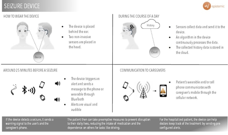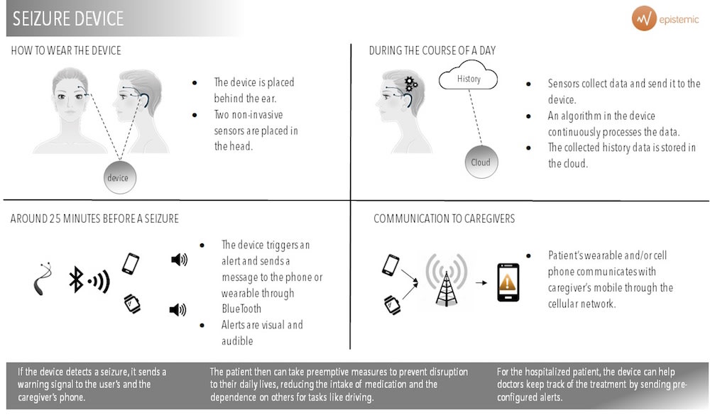 There are 70 million patients with epilepsy in the world today. Our device will provide autonomy to these patients. It alerts them with an average of 25 minutes in advance when a seizure will come. It is non-invasive, meaning there is no need of intracranial electrodes. The signal captured from the electrodes is sent to a processor in which our software runs constantly. This will detect when a seizure is imminent, and will send a message to the user´s smartphone. Our app will alert both the patient and a caregiver about the seizure and the patient´s geolocation.