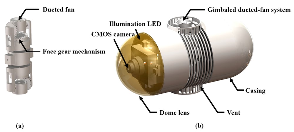 The concept of the GDF is adopted from the thrust-vector control algorithm of a space shuttle. To prevent organ damage, the ducted fan, which generates and controls the thrust required for achieving maneuverability, is mounted on a gimbal structure. A scaled-up prototype of the novel GDF system is manufactured using a commercially available three-dimensional (3D) printer. The overall conceptual design of the MCE based on the GDF system is presented followed by details of other parts needed in developing the MCE. Flow simulation and 3D path-following simulation are performed to evaluate the proposed MCE’s applicability. As a result, the mean terminal velocity of the 6:1 scaled-up MCE prototype was calculated by flow simulation and found to be 0.6047, 0.5941, and 0.9204 m/s for the three postures of the GDF system, which represented the three translational degrees of freedom. For the 1:1 scale prototype, the mean terminal velocity was calculated to be 0.1147, 0.1127, and 0.1746 m/s for the above three postures. The proposed MCE dynamic model follows the desired path profile when the Lyapunov stability–based path-following algorithm was applied to it.