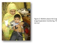 As a solution we developed an electrical impedance instrument with a special palm worn ‘Lung-Probe’ as shown in Figure-1, connected through flexible lead wires. The probe is made of a flexible rubber sheet in which four active electrodes and a fifth common electrode are fixed, and allows measurement of electrical impedance of the region under the skin where it is placed. The mother or a nurse wears this probe and places it on the child’s chest (Figure-2). A mother’s touch is usually accepted by a child who does not cry while the measurements are carried out. Respiration changes the amount of air going into the lung tissue changing its electrical impedance which is picked up through this probe and displayed through suitable instrumentation. Figure-3 shows a variation of impedance with time from which the respiration rate can be easily determined. The magnitude of the measured variation in impedance also allows estimation of localized defects of ventilation at different locations of the lungs which can give further diagnostic information. Using the prototype, measurements were carried out successfully on several babies and children; none of them cried! It was a great success of the Lung-Probe and would make a great instrument for detection of pneumonia, saving a lot of lives of infants, babies and children throughout the world.