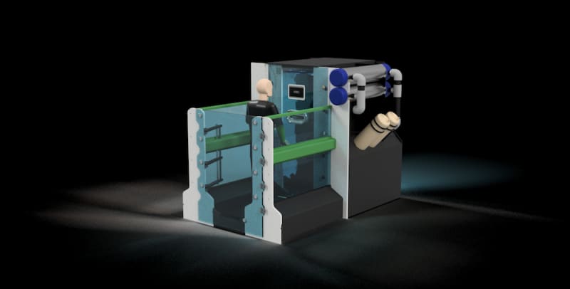 The ARK is an extremely state-of the art piece of machinery, especially for its superior market accessibility. This system can be assembled just about anywhere because it disassembles down to fit through a 29”x79” opening which is smaller than the standard doorway on a home. This opens up to leasing options for in-home health care as well as making it cheap enough for the massive fitness franchise industry that relies heavily on its existing buildings and can’t afford the structural changes for a pool. We’ve also perfected the water conditioning being able to fully germicide, add ozone, filter, and heat 200% between uses; all through a variable speed pump that can perform all of the above at up to 220 GPM. No chlorine, bromine, or salt ever needs added to the system to keep it clean. Pneumatic valves turn the handles of 3 way valves plumbed with schedule 80 pipe to automate extremely dynamic water flow without the effects of water hammer. A smart phone or tablet allows access to controls and diagnostics. Once inside, they can seal the door and may run the accessory drive with or without water. Accessories include but are not limited to a spin cycle and a treadmill. Water will be stored in the tank in front of the user where the condition and clarity of the water can be seen before using the equipment. There is also a river jet for added resistance. Once finished, the water will drain and the user can unlock the door and exit. All of the above add up to grave limitations of all competitors in the industry.
