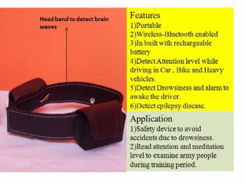 Many road accidents are due to drowsiness. To overcome this problem, we developed a new product called brain wave analyzer. This product contains a headband and analyzer box. The vehicle driver has to wear this headband while driving and the analyzer box has to be placed nearby. The analyzer box contains a microcontroller which monitors the driver's status.
