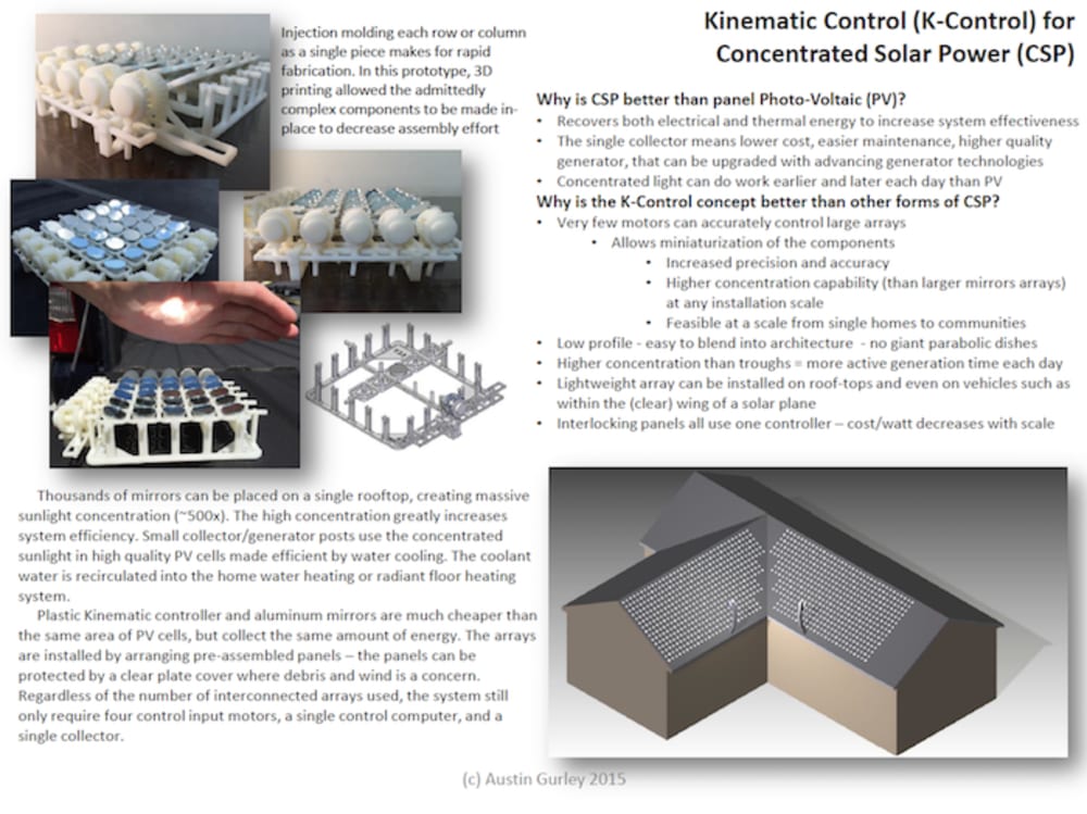 K-Control is a kinematic mechanism that will allow concentrated solar power to become economically feasible for individual homes and communities by significantly reducing the cost and size of heliostat arrays.