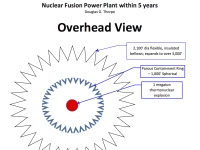 Edward Teller proposed similar plans to obtain electricity from thermonuclear bombs, except he wanted to detonate a 1 kiloton bomb every 45 minutes in a 100’D x 300’ cylinder with 4’ thick steel walls or explode bomb in a large salt dome. Teller’s plans were uneconomical because the greatest cost of the thermonuclear device is the high grade U235 uranium in the primary. Therefore, if we utilize a 1 megaton fusion device with the same 0.3 kiloton U235 primary, our U235 costs will be over 1,000 times less expensive per energy output.
