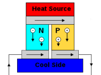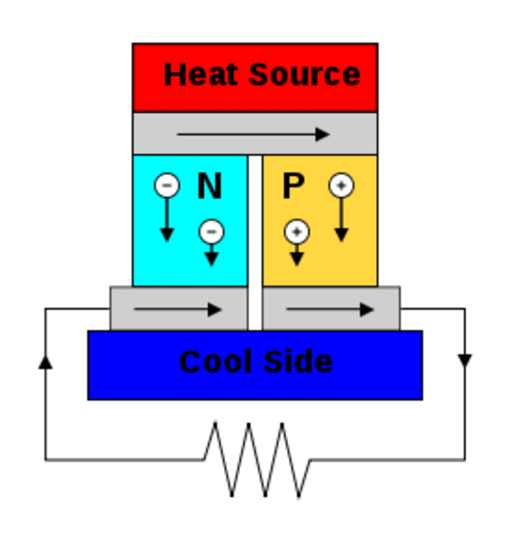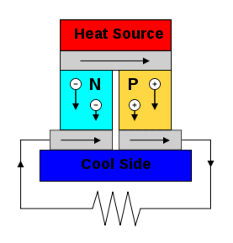 Thermoelectric power generation has been used in the space industry for years as a way to create solid state electrical power from a temperature difference. These devices use two different materials placed between a hot and cold source. The electrons in the two materials are pushed away from the hot side, due to the Seebeck effect. Because the materials are different, the number of electrons reaching the cold side is different between them. This difference creates a voltage which can be used to generate power. Thermoelectric systems often have an efficiency of 6-8%, have no moving parts, are very robust, and work for decades.
