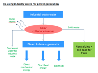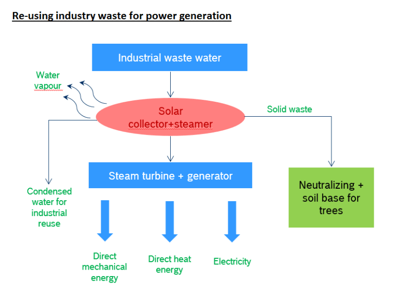 Similarly the system for industry focuses on recycling water, using it for meeting electricity and heating demands through solar thermal energy.