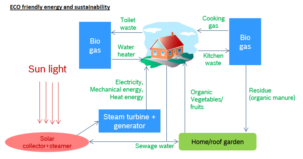 - producing steam from sewage water through concentrated solar thermal energy and driving turbines for electricity and other house hold mechanical loads like water pumps, mixers, rice grinders, air-conditioners etc.,