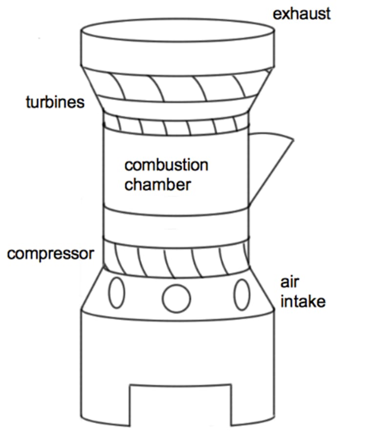 The µW2E is about the size of 2 standard pallets; pre-combustion can be performed with solid, liquid or gaseous igniters and converts the MSW into electricity. The key concept is the combination of a high firing temperature and the direct transmission of combustion energy into electricity via a gas turbine in the exhaust plume. To increase the burn temperature, a compressor is incorporated in the intake. Compression, combustion and exhaust all take place in a single stack, with stators supporting the vortex within the stack. The exhaust turbine shaft is connected to a generator, which provides electricity directly to the consumer or stores it in the integrated batteries.