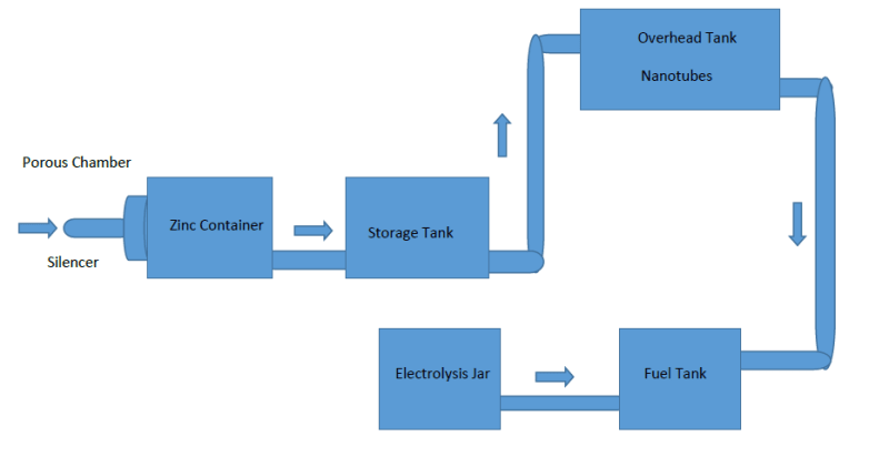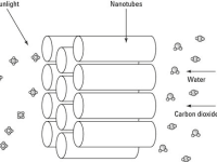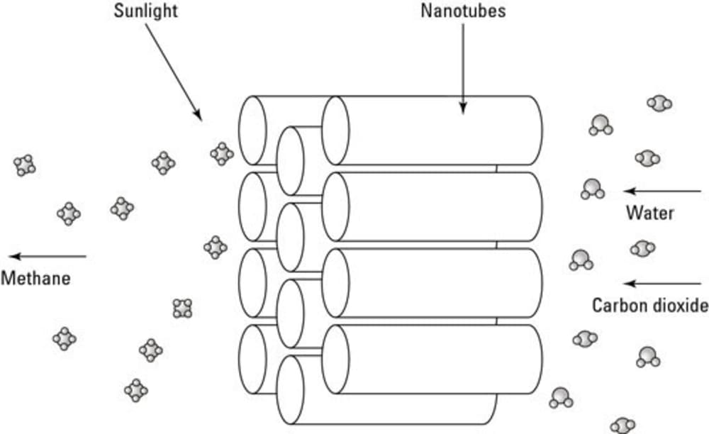 Nanotechnology can help capture carbon dioxide created during industrial processes and convert it to fuel such as methane. This process not only keeps a contaminant out of the air supply, but also turns it into a source of energy for the same factory. Here we have miniaturized this work on heavy vehicles (such as trucks). One of the ways to use captured CO2 is to convert it into a combustible fuel such as methane. All you need to do to make this conversion is to replace the two oxygen atoms with four hydrogen atoms, resulting in CH4 (methane). We are working on this method of turning captured CO2 into methane. We use clusters of titanium oxide nanotubes coated with a catalyst that helps convert carbon dioxide and water into methane using sunlight as the power source. When light falls on the nanotubes, they release energetic charge carriers, which split the water molecules inside them into two reactive components — hydroxide radicals and hydrogen ions. The hydrogen ions combine to form hydrogen gas. The devices generated roughly 160 microliters of the hydrocarbons per hour per gram of their titania nanotubes, a rate at least 20 times within ultraviolet light.