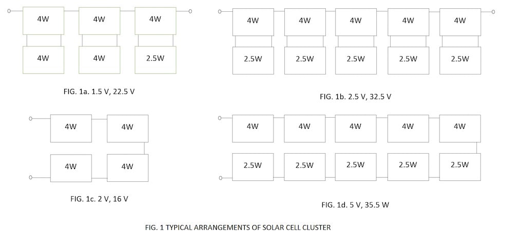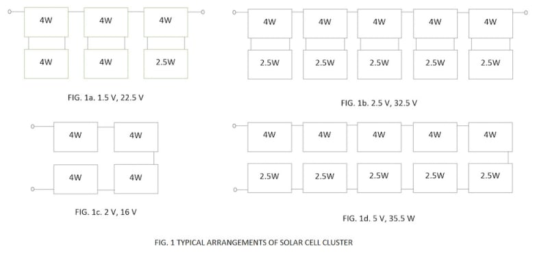 Most of the solar PV modules available commercially are produced in 12V and its multiples thereof. They are all fixed installations with rigid frames and non-portable. There are many applications where other voltages and power capacities not covered by commercial systems exist. The present invention provides a solution to circumvent the above problems by configuring solar cell arrangements for any desired voltage level in steps of 0.5V DC and electrical power in steps of 2.5 W/4 W depending on whether it is a 156 mm cell or 125 mm standard PV cell available commercially. The arrangements for the desired application can be easily configured by the user. ( Fig.1)