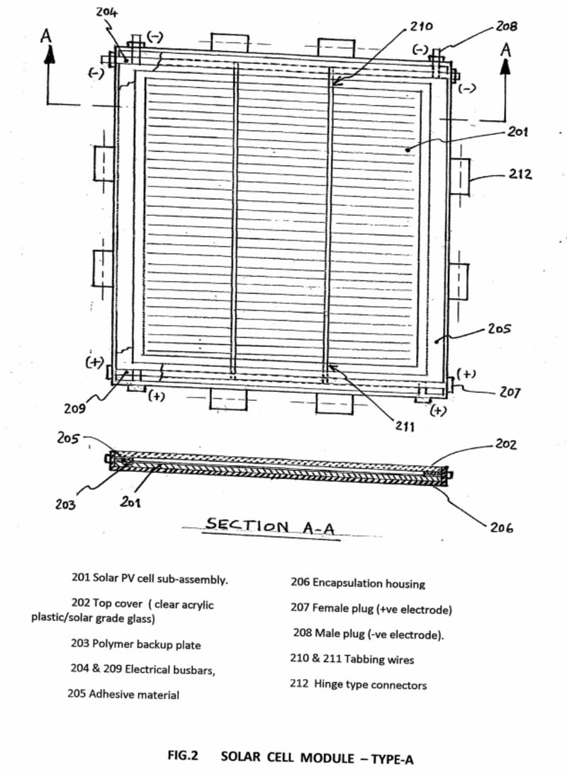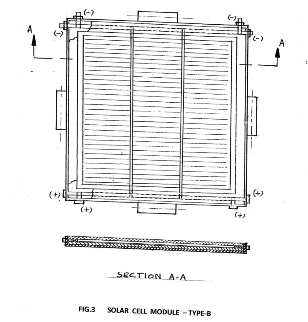 Fig. 2 depicts a PV solar module of 4 Watts, producing 0.55 volts, designated as Type-A , with a pair of hinge-type mechanical connections and male &female electrical plugs on each side of its periphery to provide electrical connectivity to neighboring modules. The various parts of such a module are listed in Fig.2. Fig. 3 depicts a solar power module of 4Watts, designated as Type-B with one hinge-type mechanical connection on each side of its periphery. A typical 2D cluster features a Type-A module connected on all four sides to a Type-B module using assembly pins. This type of 2D cluster, being flexible can be laid on either a flat surface or curved surface. The typical uses range from holiday camps to sticking them on the contour of an automobile to be hung on a camel-back. In smaller sizes, say 52mmX39mm, these can be even made as wearable jackets, providing utility power on a personal scale.