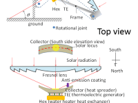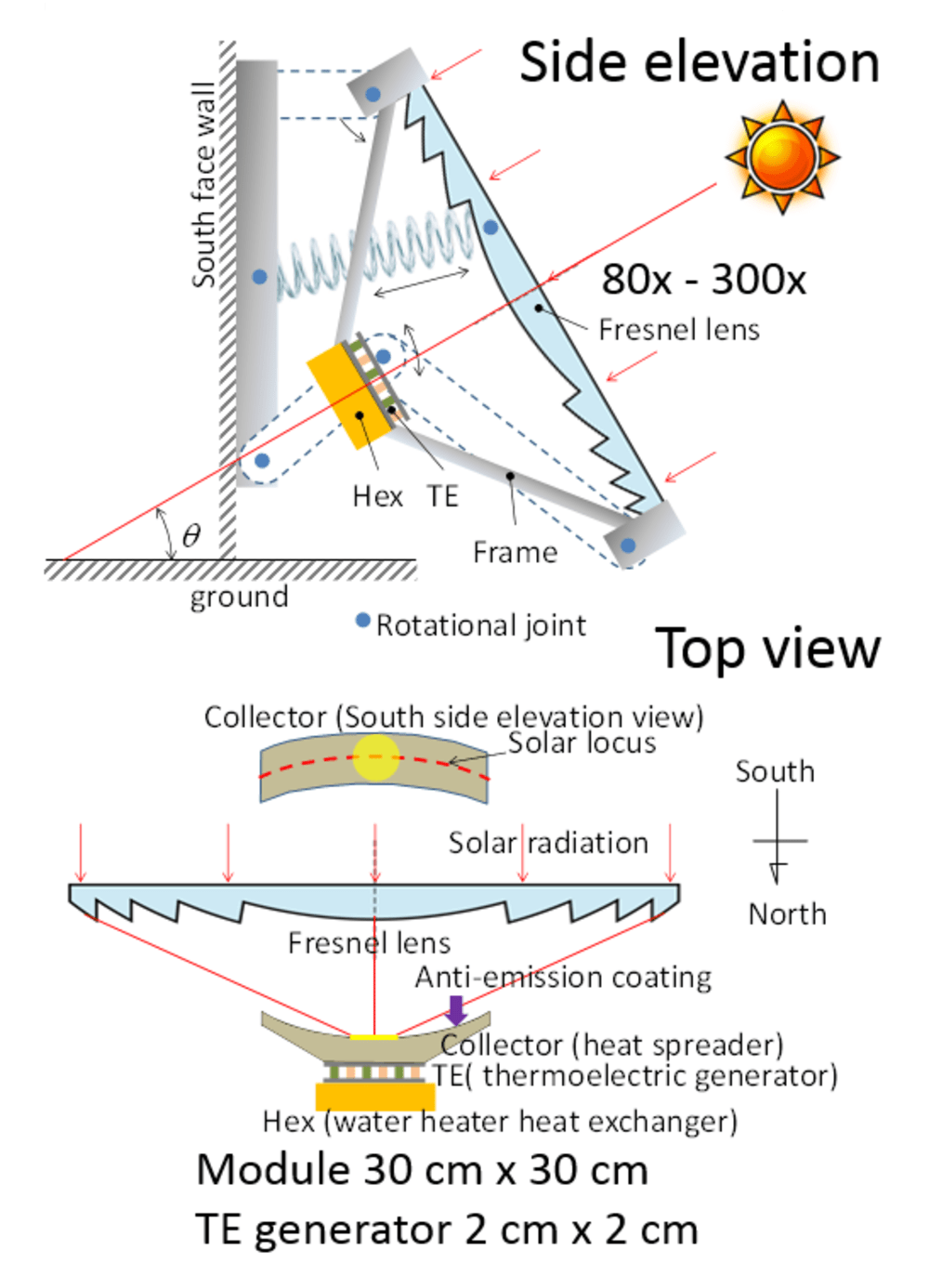 Technical advancement of wall mount is not only for the low angle solar in winter, but the simple mechanism is designed to self-track the solar angle optimally self-aligned by the ambient temperature. Which potentially use a mechanical link with a certain stiffness of spring so that the angle is adjusted depending on the air temperature based on the seasonal peak and covering the daily solar locus. To supply a heavy heat demand in winter, the design should primarily focus on heat generation in winter. Hence the form of solar collector is closer to the wall mount rather than roof top. The design optimization of TE power generator is our expert area. According to the hot water temperature requirement, the thermoelectric modules are specifically designed to obtain the maximum power output with very small amount of the cost for exotic thermoelectric materials. Since the modular design, the commercialization could begin with very small kit for water heater and then the modules are scalable to be held on the building wall as a big array.