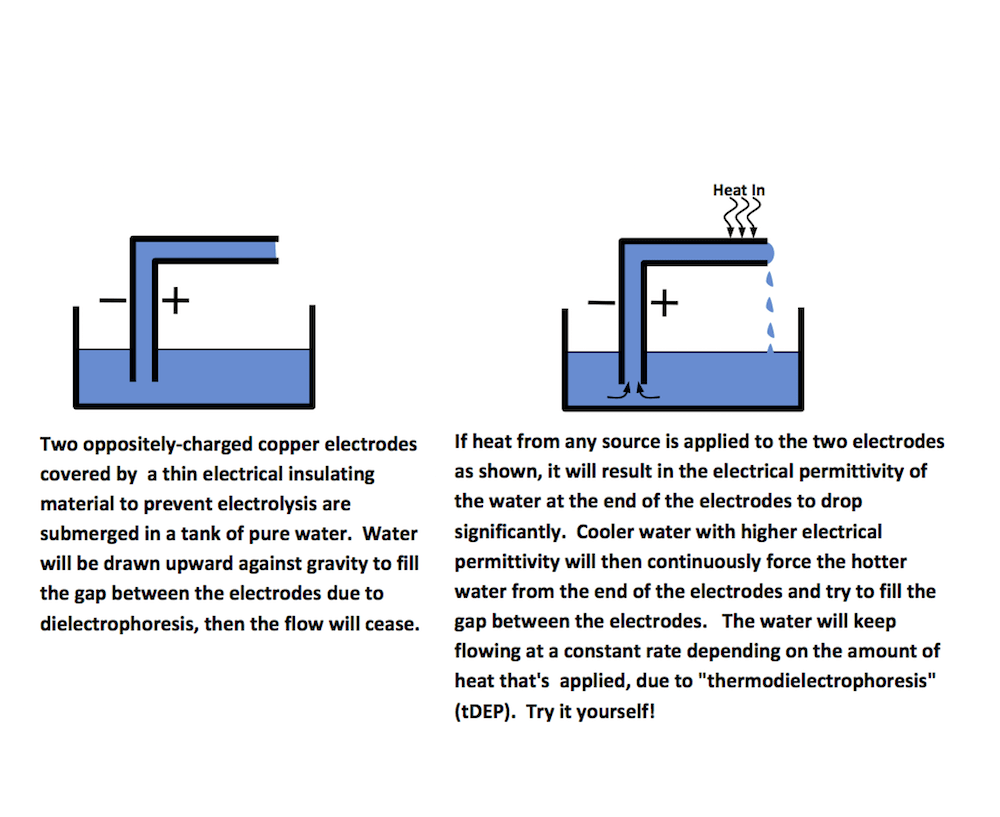 In the drawing, note that once the electrodes are energized to opposite electric potentials (voltage), there is no current drawn from a power supply. It's similar to a charged capacitor that doesn't lose its charge. That implies the flow of water is dependent only upon the amount of thermal energy applied. Thus, the "thermodielectrophoretic heat pump" has no moving parts and it gets extremely powerful and efficient at very small physical scales. For that matter, the power density of a pump of this nature made at the nanometer scale would be 50 million times greater than the power density of your local steam power-generating station! It's important to also note that the water in the experiment never boils or produces water vapor due to the heat applied, which proves it's the thermodielectrophoretic forces alone doing the work to move the water!