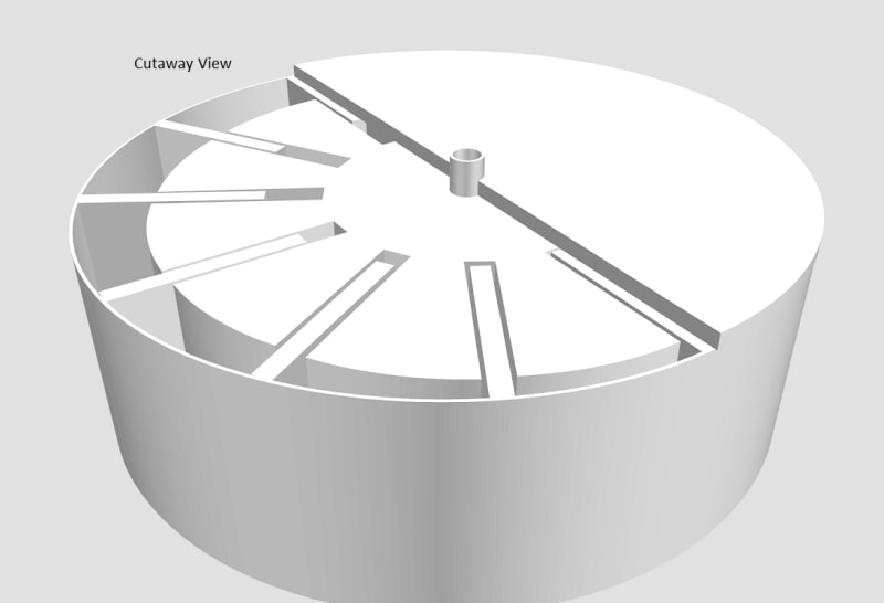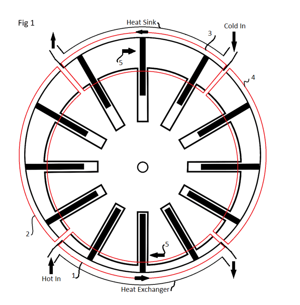 The sliding vane thermal exchange engine has a closed cylinder with a rotor having an offset axis and multiple sliding vanes attached (Fig 1). The chambers formed by the sliding vanes increase and decrease in volume on each rotation. The activity in the circular cycle of each chamber can be visualized when separated into quadrants (red outline), including two areas where the chamber volume changes very little, one large (3) and one small (1) and two where the chamber volume is either increasing (2) or decreasing (4) when the rotor is turned (clockwise 5).