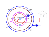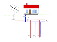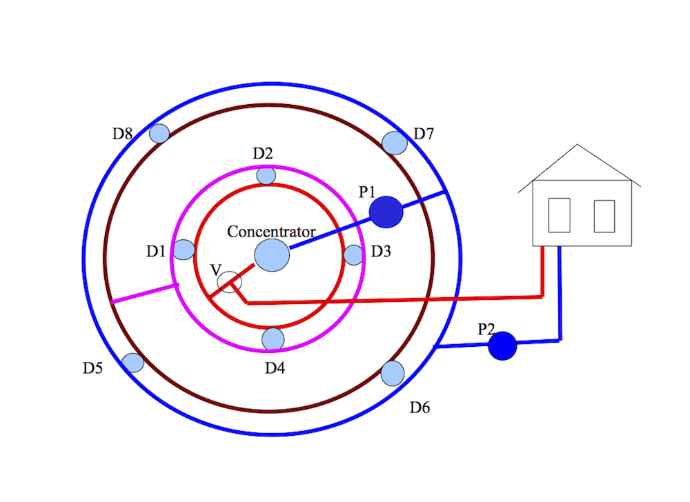 4sq meter parabolic mirror (1) is attached to heliostat. The clockwork heliostat tracks the reflected sun onto absorber placed in vacuum tube to decrease heat losses. Seasonal tracking can be manual. Mirror (1) is made of polished stainless metal sheet. Water pumps (P1, P2) move hot water from the absorber (2) directly into the home or into ground storage mass through 3-way valve (V). This ground storage system allows for solar storage during the day and can release the stored energy at night when the demand is usually higher. The storage is made up of n-drill wells (D1-Dn) and PEX tubing. Basic principle of the heating system is depicted in figure 1. Actually the drill wells are arranged around the solar concentrator. The design is in figure 2.The storage also is used as the domestic hot water source. MCU in control unit senses home temperature, drill well temperature, absorber temperature and controls 3- way valve (V) and the water pumps. The heating system can be furnished with a heat pump additionally.