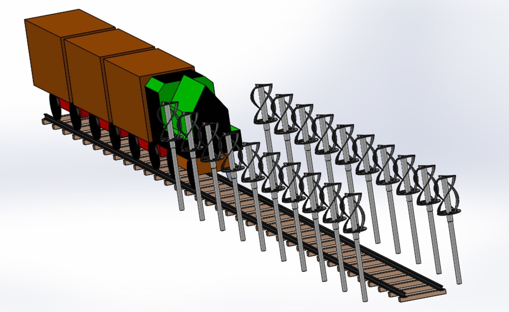 Basically air moves from high pressure to low pressure. So air is moving towards the train, in order to equalize the pressure drop. The vertical wind turbine is introduced near the train in order to harness the wind energy.