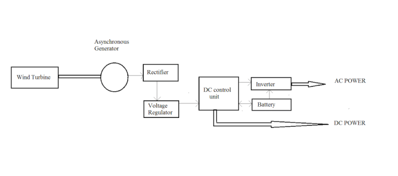 Due to the pressure drop near the train, the turbulent air moves towards the train. As we are placing the vertical axis wind turbine near the train, the wind passes over the turbine blades and rotates it. In this process the kinetic energy of the wind is converted in to mechanical energy and then it is converted into electrical energy by the use of DC generator. The DC current is stored in the battery. The inverter is used to convert DC current into AC current and the AC current is transmitted to the power station for supply.