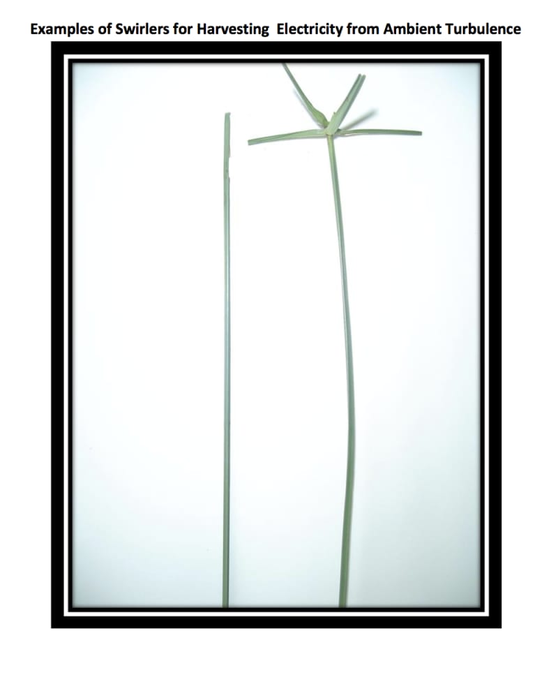The HEAT system consists of multitudes of “swirlers” which flex, bend, and sway, as they are affected by the turbulence. These movements can generate electric current as the swirlers move in response to the turbulence. The base of each swirler is anchored in a flexible, piezoelectric substrate which produces current as the substrate flexes. Swirler arrays are connected to a common circuit, where the (DC) current is used and/or stored for later uses. The HEAT swirlers would be sized to respond to situational turbulence. Swirlers will demonstrate physical attributes that allow stiffness and mass to generate maximum deformation of the piezoelectric substrate as they respond to turbulence. Different swirler designs (see Figure for two possible designs) may be required depending on the type and intensity of turbulence. For instance, the turbulence encountered in tunnels may be different than that along “Jersey walls”. Also, design modifications may be required depending on site-specific environmental factors such as weather conditions (e.g, icing), or other requirements.