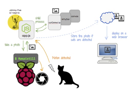 Cat detection sensor: The concept is that when a cat enters the home and start eating in the kitchen milk or fruits, the sensor starts detecting the cat's face and multiple photos are taken and it is taken to the cloud storage and once it is stored,