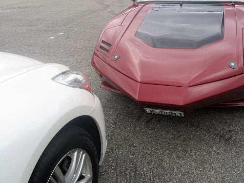 Freedom1 has a radically tapered front end , including the bumper, the hood and the nose. If this vehicle is about to collide with another vehicle or structure, all the driver must do is steer 6"