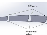 Another means of reducing the negative lift generated during the upward stroke is by making use of diffuser type entities combined with a NRV (Non-Return Valve) type arrangement on the lower side of the wing. This basic idea comes from studying the bird flight where the feathers on a bird’s wings open up, creating gaps in between to facilitate air to leak through them and hence restrain the formation of the negative pressure gradient across its wings and thereby the negative lift generation is safely avoided.
