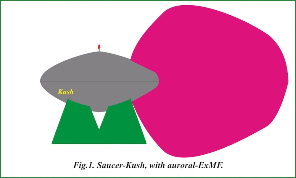 The driving, ascending, brake and stability forces are shown in Fig.3; where [A] is the ExMF Driving force (FExD) [B] is the ExMF Ascending Force (FExA) or levitation Force (FExL), [C] is the ExMF Brake or Reverse force (FExB or FExR) and [D] is the ExMF Stability force (FExS); these forces are applicable to Kush except the stability force [D]. Each mechanism contain a set of motors, attached with solenoids, producing Rotating Low Magnetic Field (RLMF), penetrating the bismuth and interacted with space electrons, ionized electrons (or protons), or electrons indirectly injected from internal charge particles accelerator such as Van de Graaff accelerator, the interaction produced intense ExMF, it also generates intense aurora light; the ExMF interacted with the bismuth to produce momentary translational force, to propel NFO according to one of the above systems.