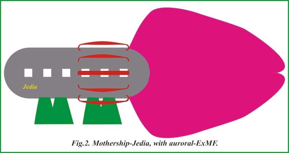 The Saucer-Kush and Mothership-Jedia, shown in Figs.1&2, are a New Flying Object (NFO) propelled by the External Magnetic Field-Propulsion System (ExMF-PS); based on the Universal Energies (UE), derived from the new fundamental physics (http://exmfpropulsions.com). The detail characteristics of Jedia mechanism is shown in Fig.3, it consists of external bismuth 1 of the propellant mechanism, and an internal ferromagnetic protecting structure 2; both linked by beams 3, axels 14 and 27.