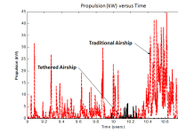 Physical Design and Concept of Operation: Design.jpg illustrates the physical design and a typical flight profile. The lower airship carries the primary payload, designed for operation in a relatively narrow altitude range in the lower stratosphere. The upper airship is designed to operate over a range of altitudes; its primary burden is the tether along with the parachute and parafoil. It carries no propulsion. Its altitude is controlled primarily by managing tether length with a reel assembly on the lower airship. The embedded graph shows the two worst years of weather data from Winds.jpg. Red and blue traces illustrate altitudes of the upper and lower airship, respectively, managed by tether length. These altitudes come close to equalizing drag, but active drag reduction is also needed. Parachutes with adjustable vents or apertures equalize the drag. Parafoils add dynamic lift (upward for the upper airship; downward for the lower airship) so that forces tending to separate the airships vertically are greater than forces tending to separate them laterally. A small engine on the lower airship is available for periods of light wind. Performance.jpg shows traditional airship thrust in red and tethered airship thrust in black for this time period. There is a 20:1 reduction in average thrust; thus, high winds have been finessed. Note especially peak wind circa year 10.6, where the traditional airship needs up to 45 kW but the tethered airship needs almost no active propulsion. Conversely, the tethered airship occasionally needs slightly more propulsion in low wind – a good engineering trade. Considered overall, the tethered airship minimizes overall energy cost, translating into smaller batteries, solar arrays, and propulsion systems.