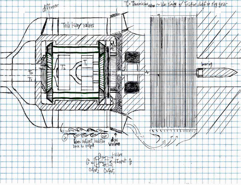 The pulse jets are controlled via the rotary disc valve, which is another disc with perforations, this time out towards the periphery (Tesla turbine discs are perforated towards the center) and are inline with the inlets to the pulse jets. As it rotates, it allows some jets to fire and creates low-pressure conditions for exhaust particles to ignite the new fuel-air mixture. Tesla valvular conduits prevent air from backing up and creating resistance in the compressor turbine. The rotary disc valve is not directly connected to the transmission- there is an intermediate planetary gear initially set to a 1:1 ratio with the planet carrier and planetary gears 'locked'. Variation comes from friction with the planet carrier (reduction) or power input to the carrier and sun gear (slight overdrive). This allows for improved timing in different conditions.
