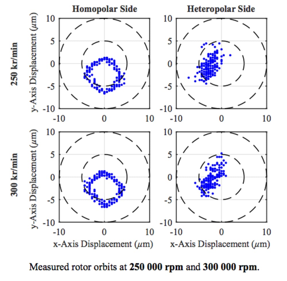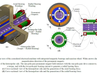 The figures demonstrate the construction and the operating principle of the novel RW with integrated magnetic bearings. The RW’s position is controlled actively in all six degrees of freedom by different dedicated windings applying a torque, an axial force, and two radial forces on two sides of the RW. The rotor’s radial displacement is measured with micrometer-accuracy by two PCB-integrated eddy-current sensors on both axial ends of the machine.