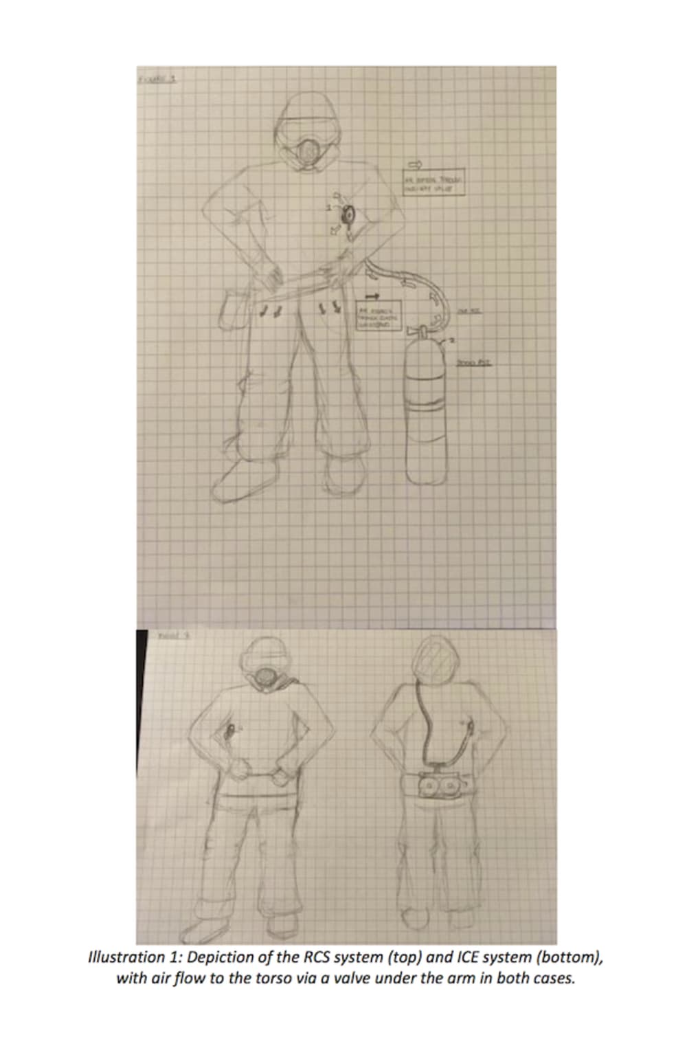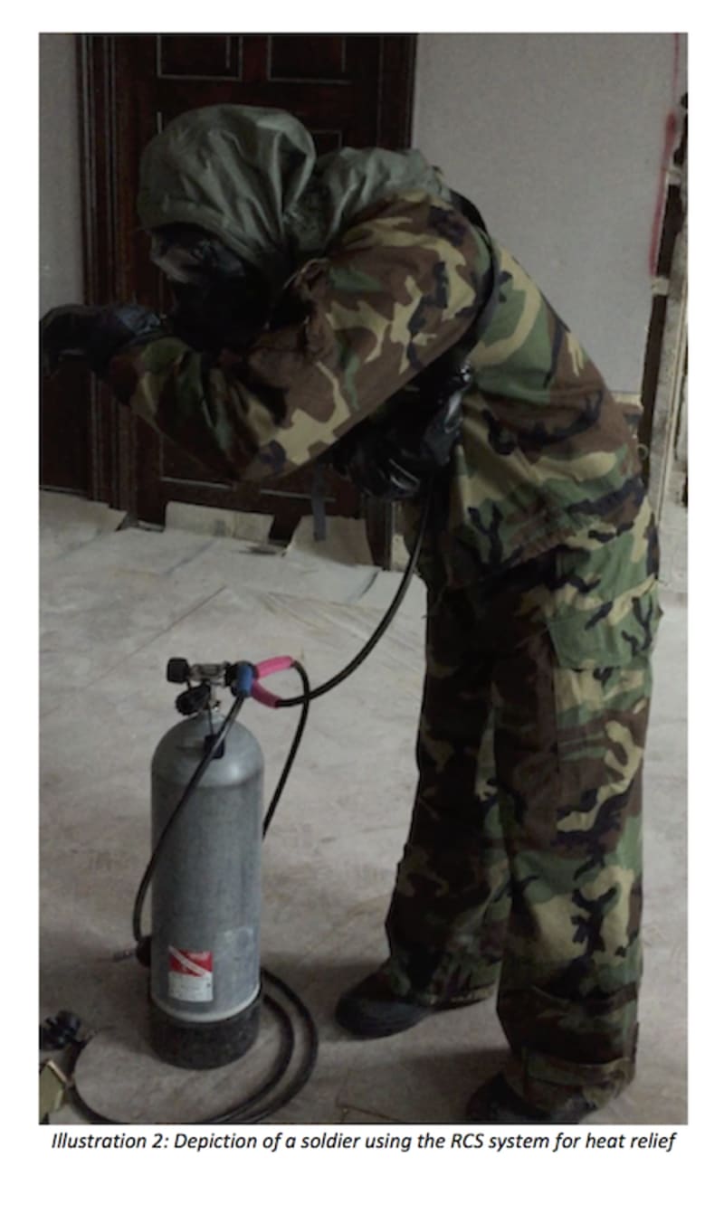 The first, called RCS, is the “stationary” solution. In this scenario, a compressed air source accompanies the operator on scene. When the operator seeks heat relief, he or she will move to the location of the compressed air source and connect a hose from the air source to a one-way valve attached to the operator’s suit. As the air enters the suit, it circulates throughout it and replaces the warm layer of air with fresh, cool air. This provides relief to the operator and allows him or her to remain effective and safe in the field for longer durations of time.