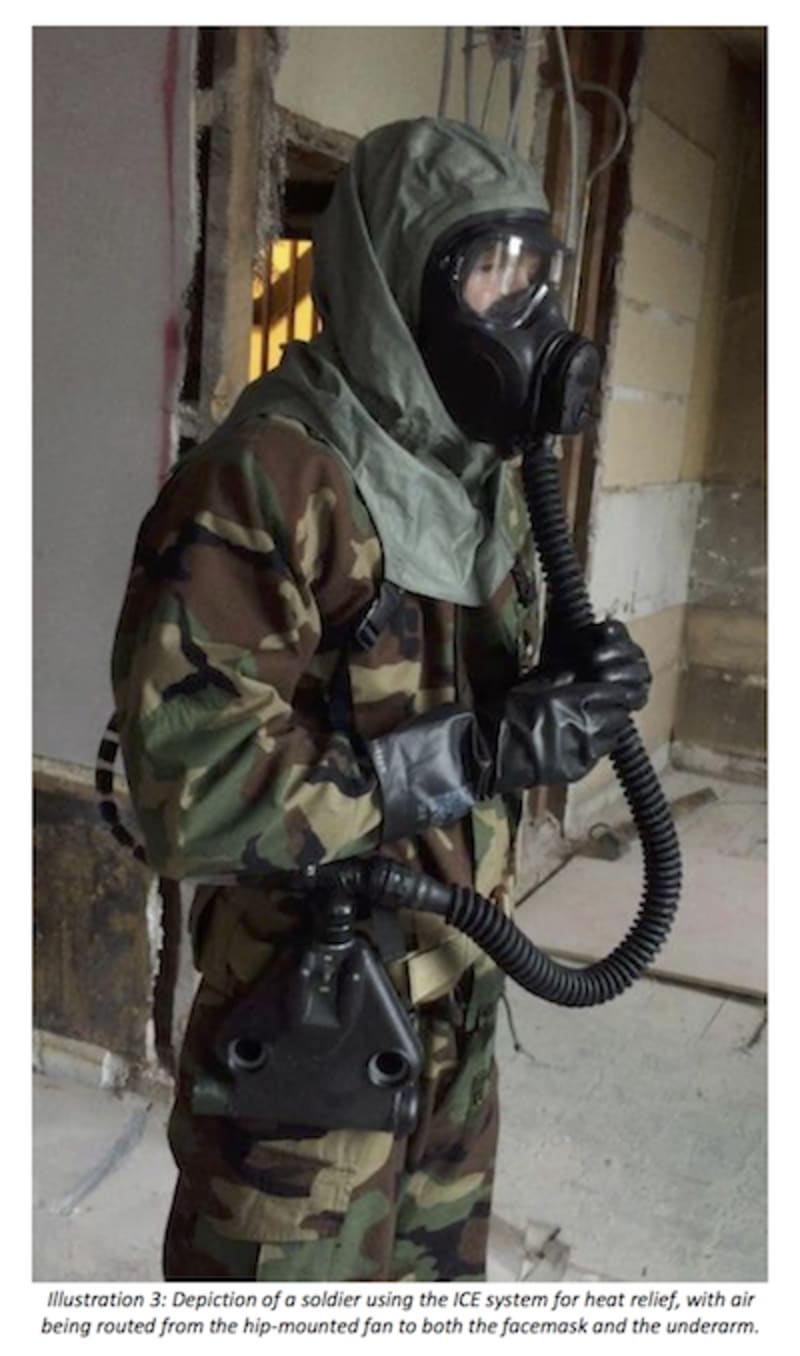 The second method, called ICE, is the “mobile” solution, and is relevant to scenarios where the operator is carrying a filtered, fan-powered air source (common to any situation requiring a facemask). The solution proposes the installation of a “T”-junction and ball valve on the outlet of the mobile air source that will allow the operator to re-route air to the torso. As the air sources typically produce more airflow than is needed for the mask alone, it makes sense to utilize the excess air to cool the body via forced convection.