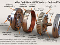 The breakthrough enabling construction of the efficiently packaged rotor was elimination of spark plugs or diesel fuel injectors via Homogeneous Charge Compression Ignition (HCCI). Timing uncertainty of HCCI is overcome using opposed-pistons with one driven rapidly toward the other as it begins its expansion stroke. Combustion occurs at any time after the process begins, and reverse torque produced at combustion by the rapid piston is ensured less than the forward torque of the expansion piston by specification of piston diameters, force angles, and lever lengths. The supercharger is regulated to elevate intake charge temperature nominally below autoignition temperature to minimize ignition delay and reduce the stroke and inertial loads associated with the rapidly moving piston. The supercharger is also oversized so intake conditions can be met during lean cold-start and operation at altitude. The upper load limit of HCCI is extended using many small bore steel pistons to handle HCCI combustion pressure at full load and push ringing frequencies beyond the audible range. Finally, the low load limit of HCCI is extended through idling of selected cylinders and excess compression preventing lean misfire.
