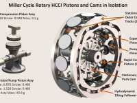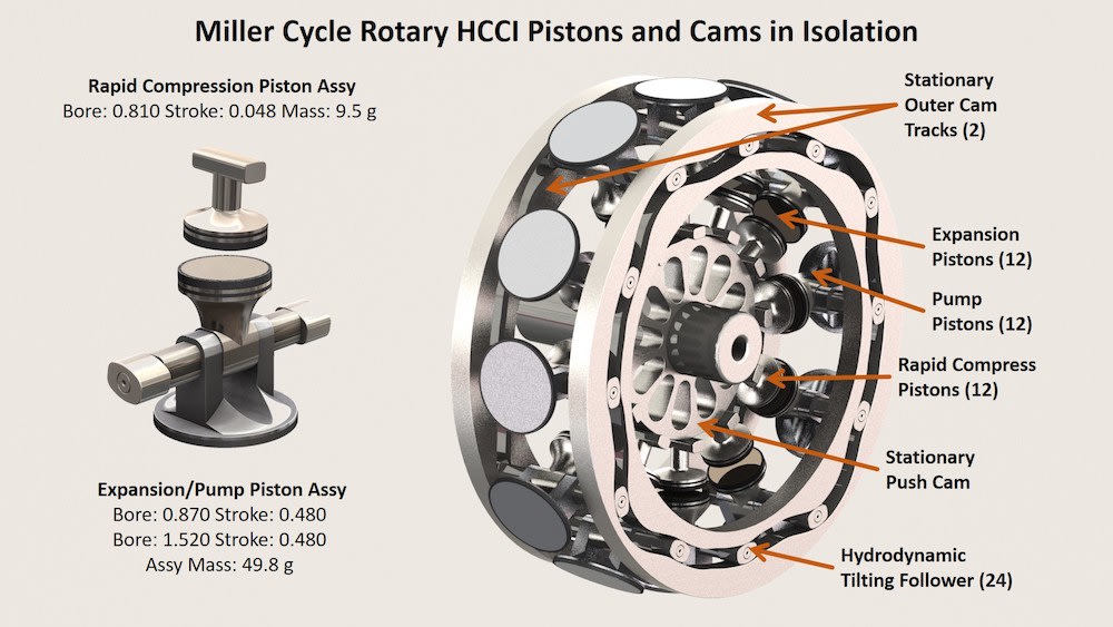 Other innovations include use of hydrodynamic tilting pad followers in the outer cam tracks, enabling high speed operation under heavy load at low cost, and use of side ports feeding the in-cylinder ports of an opposed piston uniflow scavenged two-stroke, enabling independent management of intake and scavenge charges as well as continued expansion after the in-cylinder exhaust port opens.