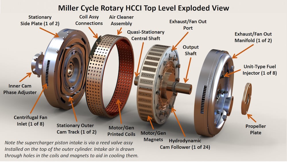 The patent pending engine design incorporates 12 sets of cylinders, each comprised of two opposing and one air pump (supercharger) piston, arranged radially in a rotating-cylinder cam-driven engine that uses diesel or JP-8 and completes 48 power strokes per revolution. Magnets are installed around the rotor periphery which, combined with coils in the radial housing, effect an integral motor/generator for starting, reverse, rapid acceleration, power generation, hybrid operation, and occasional silent running. Finally, the 12 vanes of a centrifugal cooling fan are incorporated between cylinders, and the fan’s intake air used to cool engine oil distributed via a centrifugal pump in the rotor body.