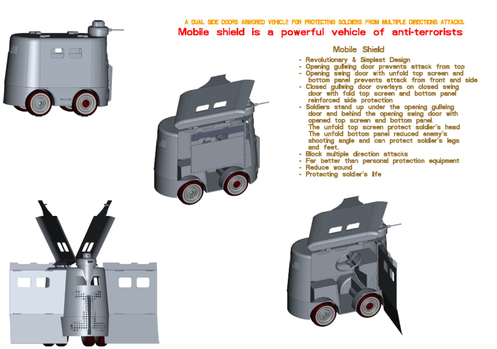 Our revolutionary Mobile Shield has dual side doors in an armored vehicle. The closed dual side doors reinforce protection, the opening dual side doors create a safe space where soldiers can stand up for watching and firing back. Our new mobile shield design can provide reliable multiple direction protection, will reduce soldier’s wound significantly. This new dual side doors armored vehicle is good plate form for autonomous driving car that can used to protect small business in unsafety neighborhood for increase local jobs by patrolling 24 hours/7 days in low risk and cost.