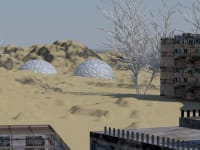 1 - A Geodesic Dome created by a light weight plastic structure. The Dome is a hemisphere, inspired by Hoberman's sphere, which can be compressed to almost (1/4)th of its original size. This character, in addition to its light weight, allows a larger amount of capsules to be transported via airplanes. The fact that they could be dropped from airplanes means they could reach difficult zones and a larger amount of humans.