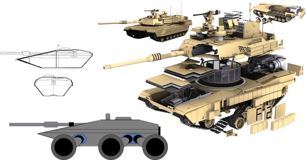 This concept combines commercial automotive providers for robotics, suspension, vehicle structure, and powertrain with existing weapons and ammunition to simplify manufacturing and lower costs. Advances in low recoil guns allow larger weapons in lighter vehicle structures. Hull placement allows greater recoil length to reduce shock effects and eliminate a muzzle brake. Robotics allow radical weight reduction and the complete re-definition of protection in a vehicle with strategic mobility. A magazine fed autoloader provides the ability to engage targets from bunkers to main battle tanks in a light and transportable design.